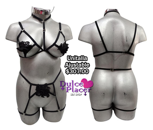 Arnés 2 piezas con flor Ajustable Negro Unitalla
